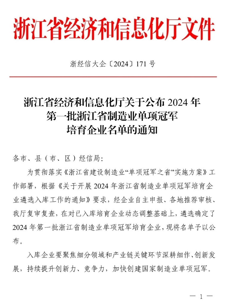 日前,,,,,,,浙江省经济和信息化厅宣布了2024年第一批浙江省制造业单项冠军培育企业名单,,,,,,,凭证《关于开展2024年浙江省制造业单项冠军培育企业遴选入库事情的通知》要求,,,,,,,经企业自主申报、各地推荐审核、省厅复审复查,,,,,,,尊龙凯时荣登榜单。。。。