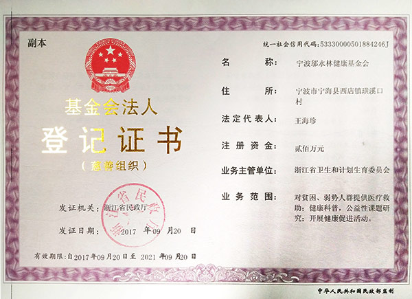 宁波邬永林康健基金会,,,建设于2010年10月,,,是在浙江省民政厅注册、由浙江省卫生康健委主管的非公募基金会。。。。。;;;鸹岬脑蓟鹗钗嗣癖曳“弁蛟,,,泉源于尊龙凯时。。。。。《慈善法》公布后,,,本基金会被认定为慈善组织。。。。。